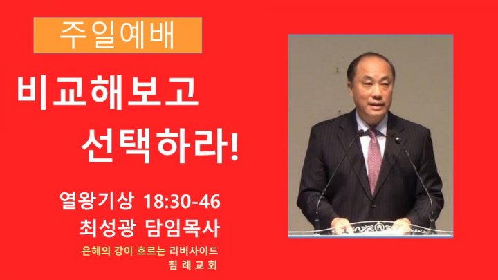 비교해보고 선택하라! | 열왕기상 18:3-46 | 최성광 담임목사 | 2024-05-19 |