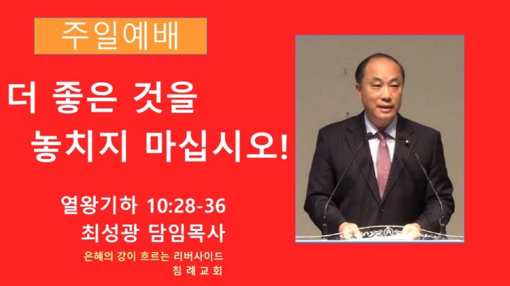 더 좋은 것을 놓치지 마십시오! | 열왕기하 10:28-36 | 최성광 담임목사 | 2024-07-14 |